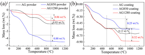 TGA was performed to quantitatively characterize the GNPs retention within the AG, AG850, and AG1280 coatings and, therefore, to investigate the effect of powder heat treatment on the GNPs retention of plasma-sprayed Al2O3/GNPs composite coatings. Figure 9 presents the TGA data of the AG, AG850, and AG1280 coatings, compared with that of their corresponding feedstock. Evidently, for each type of feedstock and coating, their weight loss during the heating process of TGA test appeared in two temperature regions. One is the weight loss between ~100–500 °C, which was considered to be primarily due to the burning of organic adhesives added in the spray-drying process, together with the evaporation of residual water within powder. The other is the weight loss between 500 and 900 °C, which is a typical combustion temperature range for graphene [22,23]. Thus, the weight loss occurring between 500 and 900 °C in TGA results represents the GNPs remaining in the feedstock or coating. It is indicated from Figure 9 that GNPs were successfully retained from the high-temperature plasma jet and retained in the three types of Al2O3/GNPs coating. In addition, the GNPs contents within the AG, AG850, and AG1280 feedstock powders (Figure 9a) were 0.93 wt.%, 0.88 wt.%, and 0.86 wt.%, respectively, which were slightly lower than the 1 wt.% that added into the initial Al2O3/GNPs mixture before spray-drying. The small loss fraction of GNPs mainly occurred during the powder fabrication process, e.g., GNPs adhered on the powder mixture container and GNPs loss during heat treatment process. Apparently, the GNPs amounts within the resultant plasma-sprayed AG, AG850, and AG 1280 coatings were 0.12 wt.%, 0.25 wt.%, and 0.32 wt.%, respectively (Figure 9b), which were lower than that in the corresponding feedstock. Only 0.12 wt.% GNPs were retained within the AG coating compared to the 0.93 wt.% of GNPs within AG feedstock, indicating that a majority of GNPs burned up during the plasma-spraying process. It is notable that the large difference in mass loss among AG, AG850, and AG 1280 powders between ~100 and 500 °C during TGA test (Figure 9a) was likely due to the difference in their moisture content, since they were fabricated using the same adhesive ratio.