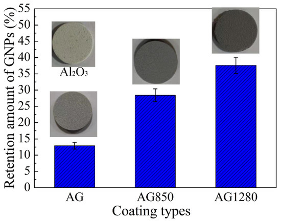 The retention percentages of GNPs for the plasma-sprayed AG, AG850, and AG1280 coating. The inserts are the optical images for the four types of coating.