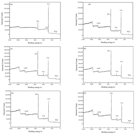 XPS survey spectra of BFs: (a) untreated; (b) treated with modification solution containing La3+ 0.1 wt.%; (c) treated with modification solution containing La3+ 0.3 wt.%; (d) treated with modification solution containing La3+ 0.5 wt.%; (e) treated with modification solution containing La3+ 0.7 wt.%; (f) treated with modification solution containing La3+ 0.9 wt.%.