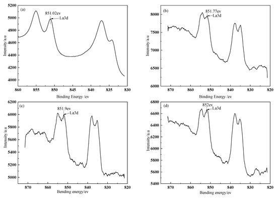 With the La3+ concentration above 0.5 wt.%, the peak of C=O began to disappear. At the La3+ concentration of 0.9 wt.%, the peak disappearances of C–O at 1260 cm−1 and the other weakened characteristic peaks were observed, implying that superabundant active groups introduced by the excess La3+ were aggregated on the BFs to be supersaturated and further destroyed formed macromolecular membrane on the BFs’ surface to trigger the loss of active groups.