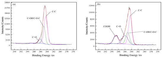 The fitted curves of C 1s spectra and the detected functional groups contents on the BFs surfaces are presented in Figure 4 and Table 4, respectively. Three small peaks of C–C, C–O– and C=O appeared under the C 1s peak of the untreated BFs surfaces in Figure 4a, indicating that C atoms were combined with O atoms. The percentage of C atoms in the corresponding chemical state was represented with the area ratio of every small peak to the C 1s peak. Due to the low content of element N on BFs surfaces, the C–N bond could be ignored.
