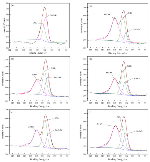 Fitted curves of Si element spectra: (a) untreated; (b) treated with modification solution containing La3+ 0.1 wt.%; (c) treated with modification solution containing La3+ 0.3 wt.%; (d) treated with modification solution containing La3+ 0.5 wt.%; (e) treated with modification solution containing La3+ 0.7 wt.%; (f) treated with modification solution containing La3+ 0.9 wt.%.