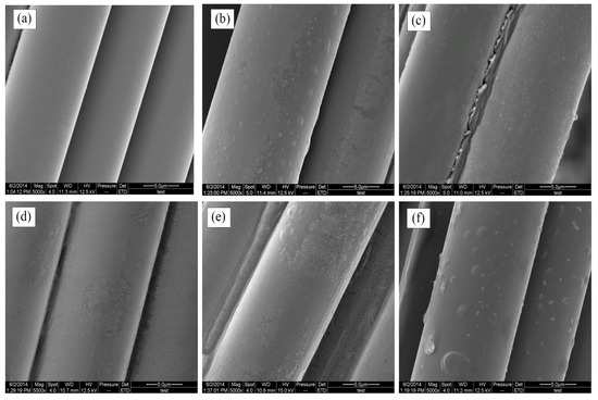 SEM images of fracture surfaces of BF/ERCs: (a) untreated; (b) treated with modification solution containing La3+ 0.1 wt.%; (c) treated with modification solution containing La3+ 0.3 wt.%; (d) treated with modification solution containing La3+ 0.5 wt.%; (e) treated with modification solution containing La3+ 0.7 wt.%; (f) treated with modification solution containing La3+ 0.9 wt.%.