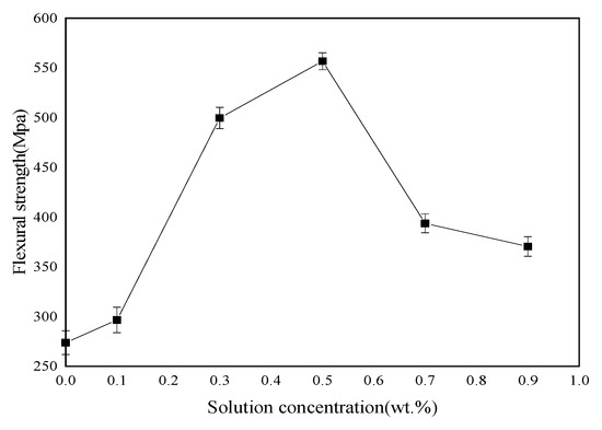 When La3+ concentration exceeded 0.5 wt.%, the mechanical strength of composites decreased as La3+ concentration increased. This may be ascribed to the fact that the excess active groups introduced by La3+ were aggregated to be supersaturated, and the triggered break of saturated active groups happened, leading to the loss of active groups. Moreover, the bits of grains on the interface of composite formed by the introduction of the excess La3+ to the fibers’ surface also reduced the interface bonding strength.
