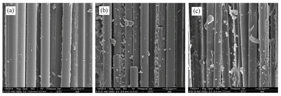 There were a few resins on the fiber surfaces of composites treated with the rare earth modification solution containing La3+ concentration 0.1 wt.%, as shown in Figure 10b. Resins increased and grooves decreased on the fracture surfaces with the increase of La3+ concentration, as seen in Figure 10c,d. These residual resins on the fibers’ surfaces were attributed in the improved adhesion between fibers and the resin matrix, when fibers were stretched from the resin matrix under the stress. When La3+ concentration was up to 0.5 wt.%, the gaps between fibers were filled with the resins in Figure 10d. BFs and the resin matrix adhered so tightly that external load was delivered to the fibers from the matrix, and the fibers mainly tolerated the breaking stress. It exhibited the obviously improved mechanical properties of BF/ERCs in the better reinforcing effect.