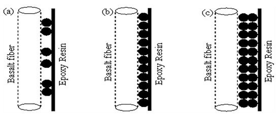 The monomolecular layer theory can be supplemented to analyze the effect of element La concentration on the tensile performances of BF/ERCs with the model shown in Figure 11. At low concentrations, few La3+ were absorbed onto the BFs surfaces. As shown in Figure 11a, the arrangement of La atoms on BFs surfaces was discontinuous with a lot of voids, resulting in the failure of BF/ERCs occurring firstly on the location without La atoms under external load. Thus, the discontinuous interface between BFs and the epoxy resin is insufficient to improve the mechanical performance of BF/ERCs obviously. When La element increased to the best concentration, 0.5 wt.%, the uniform and compact monomolecular layer on the BFs surfaces exhibits high adhesive strength between BFs and the matrix, as shown in Figure 11b. The mechanical performances of BF/ERCs reached to the highest value, including the tensile strength, the bending strength, and ILSS.