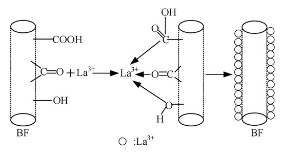 In Figure 1, Figure 2, Figure 3, Figure 4 and Figure 5, the analysis based on the FT-IR spectra and the XPS results of BFs shows that, compared to untreated BFs, active oxygen-containing functional groups on the fiber surfaces increased, once BFs is treated with the rare earth modification solution. That was ascribed to the mechanism of La element in the modification solution as follows.