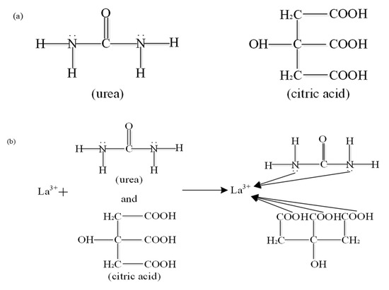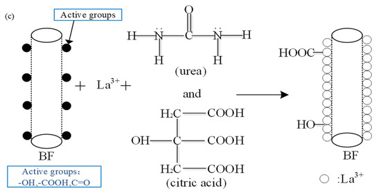 The chemical reaction mechanism of the La3+ modification solution: (a) the molecular formula of urea and citric acid in the modification solution; (b) the chemical combination between La3+ and the active groups in the modification solution; (c) the chemical combination between the BFs and the modification to introduce the more active groups.