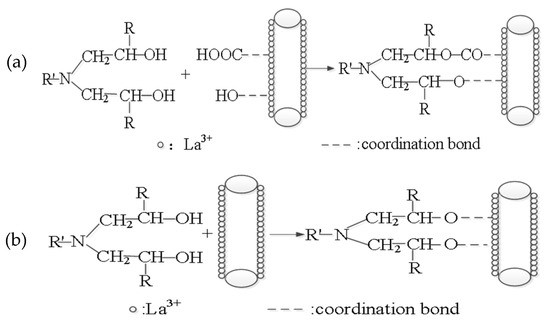 The rare earth elements with 4f electronic shell have good chemical activity. Once polarized, they have strong affinity to the nonmetal elements and turn into active elements in alcohol solution with the typical nonmetal elements such as C, H, O and N [26,27,28]. Consequently, with the results in Section 3.2.2., the coordination bonds between La ions and nonmetal elements are formed and La elements are attached onto the fiber surfaces, as shown in Figure 12.