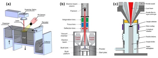 Schematic illustrations of the widely applied metal additive manufacturing (AM) processes: (a) Selective laser melting (SLM). Reprinted with permission from ref. [33]; (b) electron beam melting (EBM). Reprinted with permission from ref. [34]. Copyright 2017 Elsevier; (c) laser metal deposition (LMD). Reprinted with permission from ref. [35]. Copyright 2019 Elsevier.