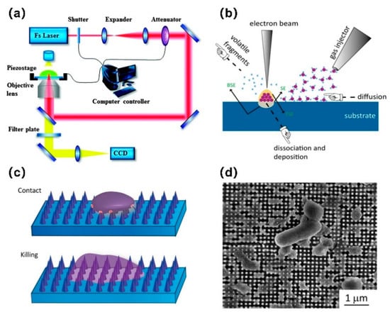 Schematic representation of (a) two-photon polymerization (TPP) (Reprinted with permission from ref. [78]. Copyright 2015 Royal Society of Chemistry) and (b) electron beam induced deposition (EBID); (c) schematic diagram showing the bactericidal behavior of a nanopattern structure, including deformation and being sunk on the nanopattern due to the penetration of the nanocolumn into the bacterial cell wall; (d) SEM image of damaged Escherichia coli bacteria on the surface of a nanopattern after 18 h of culture, observed from the above [54]. (CCD: Charge-coupled device).