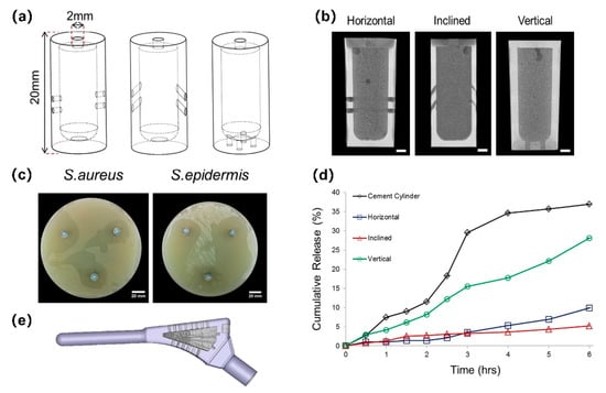 SLM Ti6Al4V implants containing a reservoir. Adapted with permission from ref. [85]. Copyright 2016 Elsevier. (a) Schematics of implants with horizontal, inclined, and vertical pore channels; (b) coronal slice of antibiotic-loaded cement within implants; (c) zones of bacterial inhibition around implants with horizontally orientated pore channels showing directionality; (d) cumulative release of antibiotic from cement cylinders and cement-filled implants with different pore orientations; (e) re-engineered functional implant.