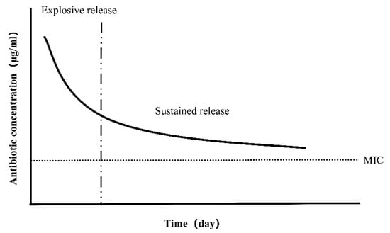 Ideal antibiotic release profile. The initial explosive release can kill bacteria effectively, and then the sustained release above the minimum inhibitory concentration (MIC) can maintain the antibacterial effect for a long period without antibiotic resistance.