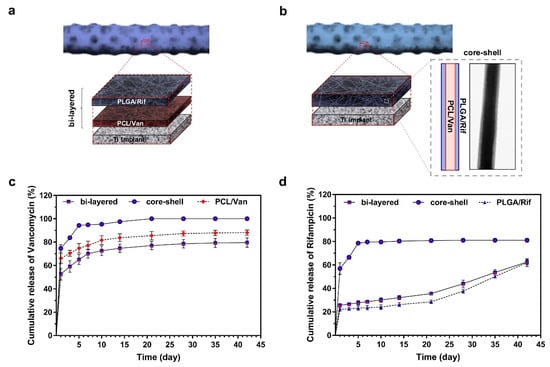 Various assembly and in vitro antibiotic release profiles of drug-loaded nanofiber-filled lattice implants. Reprinted with permission from ref. [142]. (a) The structure of the bi-layer nanofiber filled with PCL/Van as the inner layer and PLGA/Rif as the outer layer. (b) The structure of the core–shell nanofiber is composed of PCL/Van in the core and PLGA/Rif in the shell. The core–shell structure was verified by transmission electron microscope. Cumulative release of Van (c) and Rif (d) from three different nanofiber-filled lattice structures within 6 weeks. (Abbreviations: PCL, poly(ε-caprolactone); PLGA, poly`1q`(lactic-co glycolic acid); Van, vancomycin; Rif, rifampicin.).