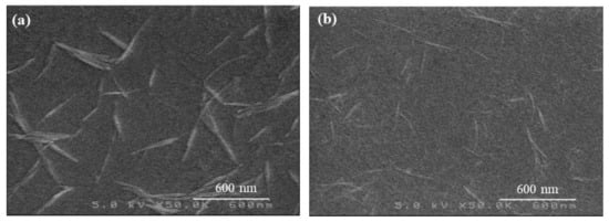 SEM images of the (a) parent ChNF/methanol dispersion and (b) SD-ChNF/aqueous acetic acid dispersion.