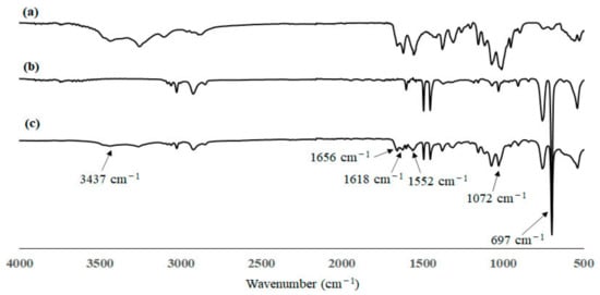 IR spectra of (a) the partially deacetylated (PDA-)ChNF film, (b) polystyrene, and (c) composite particles for run 2.