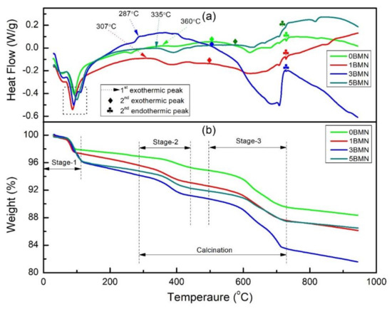 Weight loss during stage-2 was due to the decomposition of carbonates and the escape of CO2 gas [20]. The start of stage-2 was attributed to the first exothermic peak in the DSC curve, represented by dashed arrows in Figure 1a. However, the starting temperature of stage-2 was different for all the batches ranging from 287 °C for 3BMN to 360 °C for 0BMN. The last weight loss step, i.e., Stage-3, was attributed to the weight loss during perovskite phase formation and crystallization of (1 − x) NBT–xBMN. In the DSC curve (Figure 1a), there were two peaks in the temperature range of 500 °C and 750 °C. The second exothermic peak marks the start of stage-3 (crystallization) and the second endothermic peak marks its end. A maximum weight loss of 7.16% was observed for 3BMN during stage-3. No further significant weight loss was observed beyond 730 °C, showing the complete crystallization of perovskite structure [21].