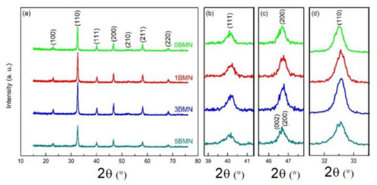 The (111), (200), and (110) peaks are magnified in Figure 2b–d, respectively. In Figure 2c, the (200) peak started to split, and a new peak started to emerge from the left in the 3BMN sample. This new (002) peak can be seen in the 5BMN sample. This means that the structures for 0BMN and 1BMN were rhombohedral with R3c symmetry [15,16]; however, with the increasing amount of BMN, the structure became tetragonal with P4bm symmetry [23,24]. Consequently, it could be said that there is a rhombohedral–tetragonal MPB that exists around x = 0.03 for the NBT–BMN system.