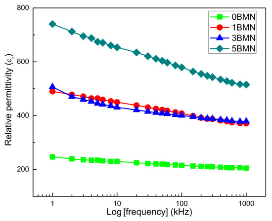 Figure 5 shows the frequency dependence of relative permittivity (εr) of 0BMN, 1BMN, 3BMN, and 5BMN samples at room temperature. The εr was maximum at low frequencies for all four samples. The εr of the 5BMN sample (750) was the maximum among all the samples, whereas the εr of the undoped sample i.e., 0BMN was the minimum among all at all frequencies. This showed the increase in εr as BMN increased in NBT [17,18]. Moreover, the εr decreased when measuring frequency increased due to a decrease in polarization [27]. At low frequencies, all the polarization mechanisms were activated, whereas, at higher frequencies, polarization mechanisms ceased to function. Therefore, the net polarization of the material decreased, which led to the decrease in εr. It is proven that relative permittivity (εr) was a function of frequency and was very prominent in the above results. The lattice distortions caused by the A or B site disorder caused the abovementioned behaviors. The Bi3+ ions substituted the A site and (Mg2/3Nb1/3)3+ ions substituted the B site of the perovskite crystal structure and caused lattice distortions in the material [10]. The polarization switching required a high dielectric constant as BMN increased in NBT [16]. Furthermore, the higher εr of 5BMN could be due to better densification during sintering [22]. The difference in the decrease in relative permittivity (εr) as the frequency increased was maximum in the 5BMN sample and minimum in the 0BMN sample. This trend shows the difference in the decrease in the rate of relative permittivity (εr) increase as BMN doping increased.