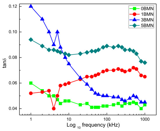The frequency dependence of dielectric loss (tanδ) for sintered 0BMN, 1BMN, 3BMN, and 5BMN samples at room temperature was determined, as shown in Figure 6. For 3BMN, the steep decrease in tanδ in the frequency range of 1 kHz and 100 kHz indicated leakage current [28]. During polarization (below 10 kHz), 3BMN showed the maximum loss. As the frequency started to increase, the dielectric loss slightly decreased for 0BMN. For 1BMN, it started to increase with the increase in frequency, whereas, for 5BMN, it stayed within a certain range. At lower frequencies, the friction due to dipole rotation increased dielectric losses. There was a slight hump in the losses of all samples in the range of 100 kHz to 1000 kHz, showing relaxor behavior [29]. This could be attributed to the change in the polarization mechanism due to the increase in frequency [9,30]. At higher frequencies (i.e., 1000 kHz), 5BMN displayed the highest tanδ, whereas 0BMN displayed the lowest tanδ among all samples.