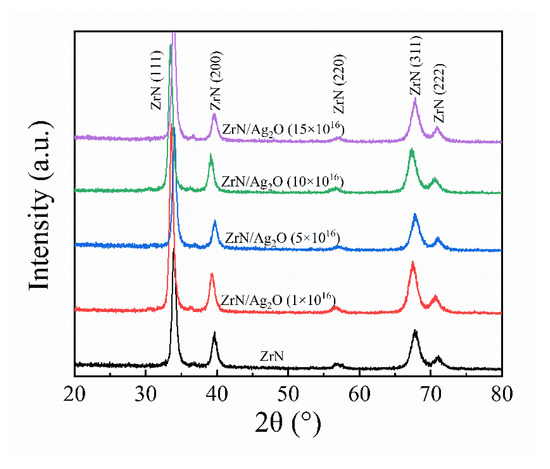X-ray diffraction pattern of the separate ZrN coating and different doses of ZrN/Ag2O gradient composite coatings.