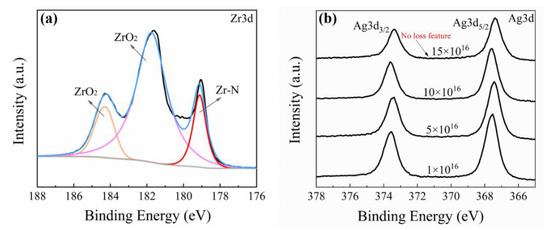 (a) XPS spectra of Zr-3d from ZrN/Ag2O gradient composite coating; (b) XPS spectra of Ag-3d from different doses of ZrN/Ag2O gradient composite coatings.