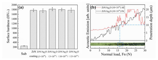 As shown in Figure 5a, for the existence of a ZrN ceramic phase with high hardness in the micron dimension, the micro hardness of both the separate ZrN coating or ZrN/Ag2O composite coatings increase to ~1800 HV0.1, almost the septuple of that of the pure Ti substrate. It is indicated that the improvement of mechanical properties is primarily contributed by the ZrN ceramic phase (micron dimension) as the main reinforced coating, while the Ag2O nanoparticles (nano dimension) have scarcely any degree of contribution on this part. Therefore, the chosen ZrN/Ag2O (10 × 1016 icon/cm2) composite coatings can represent different doses of silver ions specimens for further study about mechanics, such as adhesion and wear resistance, because they exhibit the features of unity in mechanical properties. The scratch appearance, the relevant acoustic emission spectra and penetration depth have been shown in Figure 5b. The critical load at the ZrN/Ag2O (10 × 1016 icon/cm2) composite coating stripped from the substrate is about 16~17 N. Simultaneously, the penetration depth precisely surpasses the thickness of the coating (about 10 μm), indicating that the composite coating has been worn through at this critical load.