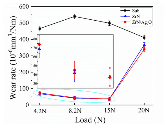 Wear rates of different specimens (substrate, separate ZrN coating and ZrN/Ag2O composite coating) under axial load from 4.2 to 20 N.