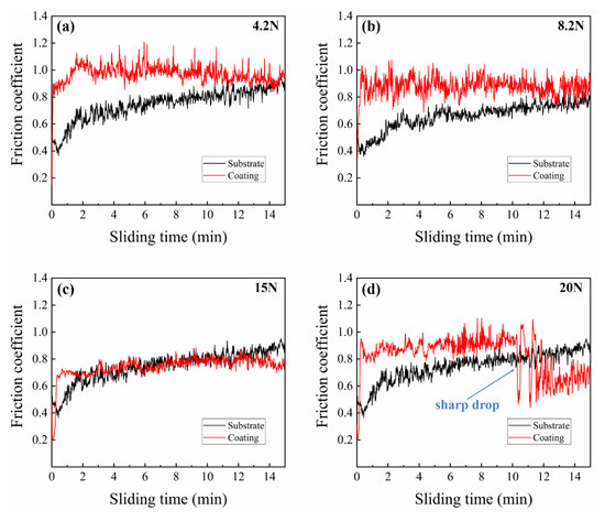 Coefficients of friction of substrate and composite coating specimens under different axial loads: (a) 4.2 N; (b) 8.2 N; (c) 15 N; and (d) 20 N.