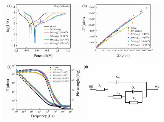 Potentiodynamic polarization and EIS measurements of different specimens in Ringer’s solution: (a) the typical potentiodynamic polarization curves recorded on the substrate, separate ZrN coating and ZrN/Ag2O micro–nano gradient composite coatings with different doses of silver ions; (b,c) the representative Nyquist and Bode plots for the tested samples, respectively; and (d) the equivalent circuit (EC) model used to simulate the EIS data of the composite coating and substrate in Ringer’s solution.