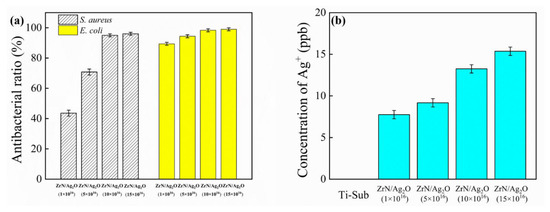 (a) Antibacterial ratios of the re-cultivated S. aureus and E. coli colonies on agar for different doses of ZrN/Ag2O gradient composite coatings; (b) the release concentration of silver ions for different doses of ZrN/Ag2O coatings in Ringer’s solution after 30 days.