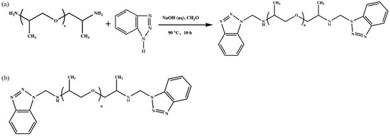 The JD2000 derivative were prepared via the following procedures. First, the benzotriazole (1.25 g, 10 mmol) was introduced into the sodium hydroxide solution (8 wt.%, 100 mL). Then, a Jeffamine D2000 (21.05 g, 10 mmol) and 37 wt.% formaldehyde solution (0.85 g, 10 mmol) were added under magnetic stirring. The mixture was heated to 90 °C, and the sulfuric acid aqueous solution (80 wt.%, 8 mL) was introduced into the mixture. The reaction continues for 10 h at 90 °C. Finally, the mixture was cooled to a yellowish diaphanous viscous liquid, and the Jeffamine-triazole derivatives (JD2000) were obtained. The reaction formula and structural formula of the JD2000 are shown in Figure 1.