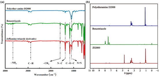 Figure 2a shows the FTIR spectra of the JD2000. Sharp peaks near 3030 cm−1 were observed in the FTIR spectra of the JD2000, which were assigned to the stretching vibration peak of the C–H bond of the benzene ring. The peaks near 1600 cm−1 were due to the stretching vibration of the –CH3 bond. The stretching vibration peak near 1100 cm−1 was assigned to the N=N double bond. The strongest peak at 1170 cm−1 was the stretching vibration peak of the C–O–C single bond, proving the existence of the ether bond appearing in the spectra of the JD2000. The FTIR results demonstrate that the JD2000 was successfully produced from benzotriazole and formaldehyde. Figure 2b shows the 1H NMR spectra of the JD2000. The chemical shifts of 7.79 and 7.34 ppm represent the hydrogen atoms in the benzene ring, the chemical shifts of 4.45 ppm represent the signal of the active methylene group, and a new peak was produced. The peaks of 1.0 and 3.86 ppm represent the methyl and methylene signals on the polyether chain. The nuclear magnetic resonance data show that the product contained benzotriazole and polyether chains, and the target product, JD2000, was successfully obtained.