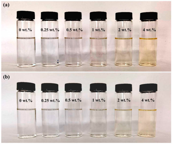 Figure 4. The JD2000 aqueous solutions with different concentrations with standing time of: (a) one day; and (b) one month.