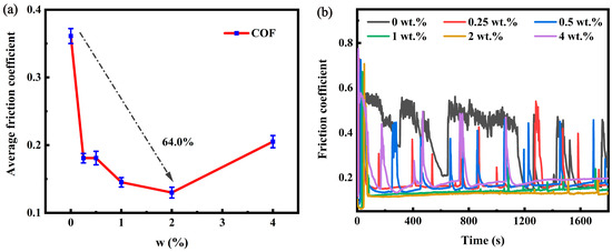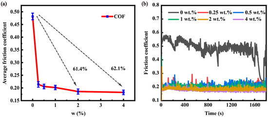 To test the anti-friction property of water with JD2000 concentrations ranging from 0 to 4 wt.% on the steel plates, the tribological test was conducted on the UMT-tribolab tester. The test results of the average friction coefficients (COF) of the different concentrations of the JD2000 aqueous solutions are shown in Figure 5a. It can be seen that the COF of the distilled water was 0.481. After adding the lubricant, the COF decreased obviously with increasing amounts of the additive. When the JD2000 concentration was 2 wt.%, the COF was 0.185 compared with the distilled water, and the anti-friction property was improved by 61.4%. When the concentration further increased to 4 wt.%, the COF of the system was 0.182, and the anti-friction property was improved by 62.1%. The COF reduction was not obvious compared with the case of 2 wt.%. The results show that the lubrication effect of the JD2000 was sensitive to its concentration. The low concentration JD2000 did not form tribofilms. In this study, a JD2000 concentration of 2 wt.% was applicable for the JD2000 to exert its lubrication ability.