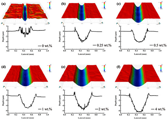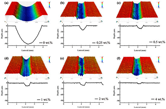 Figure 6. The surface curves and WLI morphologies on the worn disks lubricated using the JD2000 water aqueous solutions with different concentrations: (a) 0 wt.%, (b) 0.25 wt.%, (c) 0.5 wt.%, (d) 1 wt.%, (e) 2 wt.% and (f) 4 wt.%.