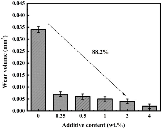 The wear volume at the wear mark on the aluminum plates with different concentrations of the JD2000 water solutions after the tribological experiment were calculated. The results are as shown in Figure 9. With an increase in the concentration of the additive, the wear volume gradually decreased. It can be seen that the wear volume of the distilled water was 0.034 mm2. With the addition of 2 wt.% JD2000 in the water, the wear volume of the abrasion mark was 0.004 mm2, which was reduced by 88.2% compared with that of the distilled water. Therefore, the JD2000 had an excellent anti-wear property on the aluminum plate.