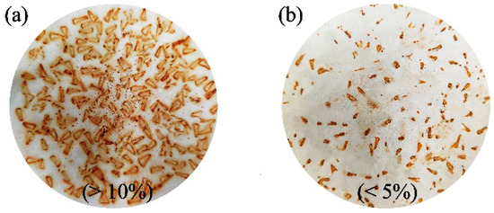The results of corrosion tests are shown in Figure 10. Corrosion grades were assigned according to the JB/T 9189-2016. It can be observed that, when the distilled water was used as anti-rust solution, the surface rust area of filter paper was more than 5%, which belongs to severe corrosion. When the 2 wt.% JD2000 aqueous solution was used as anti-rust solution, the surface rust area of filter paper was between 1% and 5%, belonging to moderate corrosion. Comparing the area of rust spots produced by the two kinds of anti-rust solutions, it can be seen that the addition of the JD2000 can reduce the corrosion degree by about 75.5%, which has significant anti-rust performance.