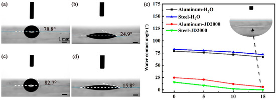 Figure 11. Aqueous contact angle goniometry dip-coated with: (a) distilled water on the steel plates; (b) 2 wt.% JD2000 on the steel plates; (c) distilled water on the aluminum plates; and (d) 2 wt.% JD2000 on the aluminum plates. (e) The adsorption curves.