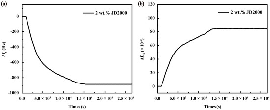 Figure 12. (a) Frequency variation curve and (b) energy dissipation factor variation curve of the 2 wt.% JD2000 aqueous solution on the metal surface.