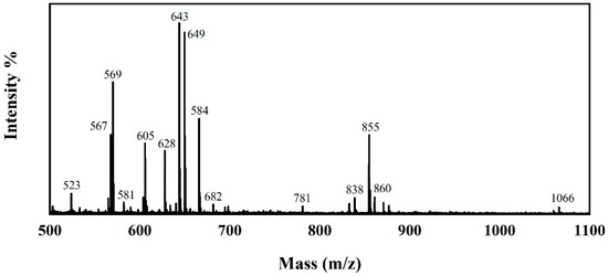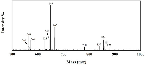 Figure 17 shows the MS of the friction-tested aluminum plates under the 2 wt.% JD2000 lubrication condition. It can be seen that the polymer can be detected at the wear place of the aluminum plates after lubrication with the JD2000, and the results are very similar to those of the steel plates. When the m/z values were near 569 and 855, it was speculated that this molecule was a JD2000 long chain that lost C6H4N3CH2NH– and CH3–, and its degrees of polymerization were 7 and 12. When the m/z value was near 649, the corresponding molecule was the additive long chain with the lost C6H4N3CH2NH– structure, and the degree of polymerization was 8. The results show that the chain of the JD2000 molecule broke and formed chains with different molecular weights during the friction process. This then filled in the wear track to prevent direct contact with the uneven metal surface.