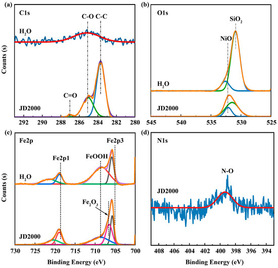To further investigate the chemical composition of the tribofilms and illustrate the changes in the chemical states of the several typical elements on the worn surfaces, the composition of the wear marks on the steel plate after the friction test was analyzed using XPS. Figure 15 shows the high-resolution XPS spectra of C1s, O1s, Fe2p, and N1s. All of the XPS spectra were fitted using the Lorentzian–Gaussian method. The C1s spectra of the surface have a weak peak at 285.1 eV, which represents the C–O chemical bond. There are two new peaks in the C1s spectra of the lubricating film formed by the JD2000, and the peaks at 288.5 and 286.1 eV represent the C=O and C–C bonds of the lubricating film, respectively. These results indicate that the hydrocarbon compounds were absorbed tribo-physically on the worn surface. The peak of O1s at 531.0 eV came from the SiO2, and the additive-containing lubricant also contained NiO bonds in the friction film formed during friction. The peak of the Fe2p spectra at 708.3 eV corresponds to the binding energy of FeOOH. In addition, the binding energy peak at 705.7 and 718.8 eV correspond to Fe2p3 and Fe2p1, respectively, while the new signal peak at 76.5 eV is assigned to the Fe2O3, which was one of the components of the surface friction film. The spectra results of the N elements show that the active nitrogen elements in the additive also adsorbed on the surface of the steel plate, producing the binding energy peak of the N–O bond at 399.3 eV. This made the long chain in the JD2000 bind tightly to the surface of the steel plate during the friction process, and thus it played a protective role to prevent direct contact between the metal friction pairs.