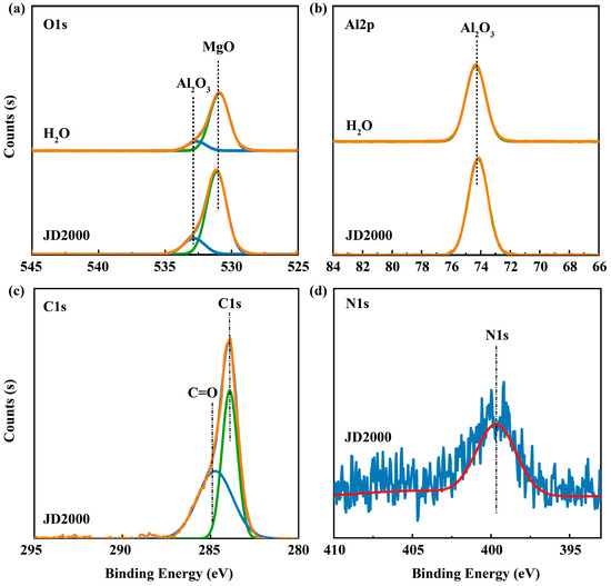 To further investigate the chemical composition of the tribofilms and describe the lubrication mechanism of the JD2000, the compositions of the wear marks on the aluminum plates after the friction test were analyzed using XPS. Figure 18 shows the high-resolution XPS spectra of O1s, Al2p, C1s and N1s, illustrating the changes in the chemical states of several typical elements on the worn surfaces. All the high-resolution XPS spectra were fitted using the Lorentzian–Gaussian method. The Al2p and O1s spectra of the worn surfaces under the two lubrication types were analogous. The weak peaks at 74.2 eV for Al2p and Al2p signal intensity of the JD2000 were slightly stronger, which came from the reaction of the Al element with O during the friction process. The O in the JD2000 molecule promoted the formation of a more stable Al–O bond on the metal surface. The O1s spectra of both were at 531 eV, and the signal peaks at 532.8 and 532.8 eV were from Mg–O and Al–O, respectively. The peak of the JD2000 was slightly higher, which indicated that the oxygen element in the JD2000 also participated in the formation of the chemical bond. The peaks of the C1s spectra of the JD2000 at 284.6 and 285.6 eV came from the C–C and C–O bonds, respectively. The spectra of the N elements showed that the active nitrogen elements in the additive reacted with aluminum to produce the binding energy peak of the Al–N bond at 398.2 eV. This makes the long chain in the JD2000 bind tightly to the surface of the steel plate during the friction process and play a protective role in preventing direct contact between the metal friction pairs. This demonstrated that the long chain structure of the JD2000 molecules was part of the friction film, which filled in the wear marks and played a protective role during the friction process.
