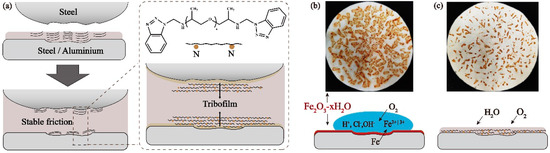 Figure 19. (a) Lubrication mechanism; (b) corrosion mechanism; and (c) anti-rust mechanism.