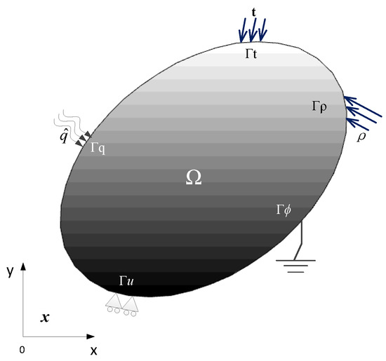 As indicated in Figure 1, a linear isotropic homogeneous piezoelectric domain subjected to the thermo-electro-mechanical loadings is considered. In this domain, the mechanical boundary conditions and prescribed electrical potentials are applied to the boundaries , , respectively. At the same time, the traction t and the heat flux q act on boundaries , , respectively.