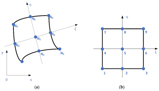 The standard C0-continuous 2D and 3D Lagrange isoparametric elements are used to discretize the computation domain [25]. As illustrated in Figure 2, a 2D quadrilateral element with nine nodes is considered here. The main characteristic of the elements is that an independent node is distributed inside the elements. Based on the isoparametric element, the geometrical and physical variables over the element can be approximated according to the nodal values of the element.