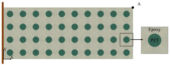 A piezoelectric composite structure composed periodically distributed unit cells (4 × 10) is considered in the first example. As indicated in Figure 4, the whole size of the square unit cell is 60 mm × 60 mm. The unit cell is made of two types of materials (Epoxy and PZT-7A). The diameter of the circular piezoelectric fiber is 30 mm. The left end of this structure is firmly fixed. The bottom temperature value is set to 100 °C, while the value for the top face is set to 500 °C. At the same time, the electrical potential at this part of the structure is set to zero. The material constants for the piezoceramic and non-piezoelectric matrix are listed as follow: