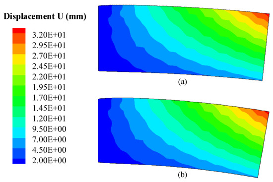 Displacement in the X direction (U) of the cantilever beam calculated by (a) FEM (b) TP-EDM.