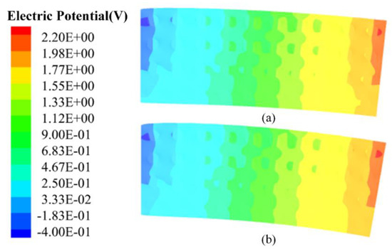 The electrical potential of the piezoelectric composites calculated by (a) Abaqus and (b) TP-EDM.