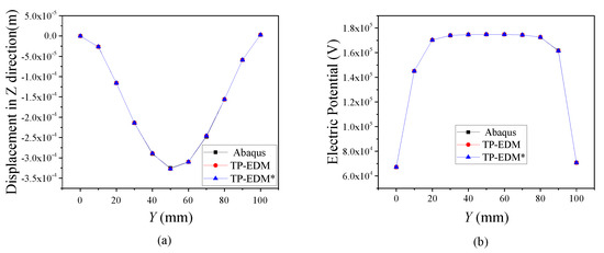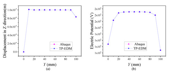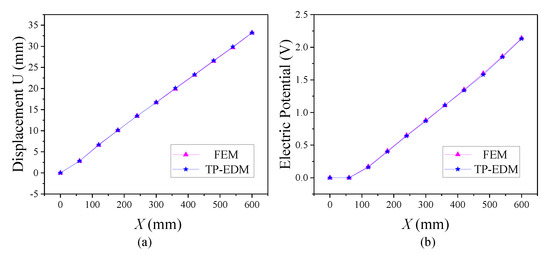 Furthermore, the maximum electrical potential and displacement at point A are listed in Table 1. At the same time, the electrical potential and displacement along the line of the bottom face are provided Figure 7. The results computed by the two methods are in good agreement, which shows the accuracy of the presented method (TP-EDM).